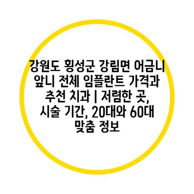 강원도 횡성군 강림면에서 임플란트 시술을 생각하고 있는 분들을 위해 추천 치과와 함께 후기를 정리하였습니다. 이 글에서는 임플란트 가격, 시술 날짜, 추천 치과의 특징 등을 자세히 설명합니다. 특히 20대와 60대 각각의 맞춤 내용을 알려드려 보다 쉽게 치과를 선택할 수 있도록 돕겠습니다.