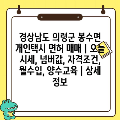 경상남도 의령군 봉수면에서 개인택시 면허를 매매하려는 분들을 위해 시세, 넘버값, 자격조건, 월수입, 양수교육 등 상세 정보를 알려드립니다.
