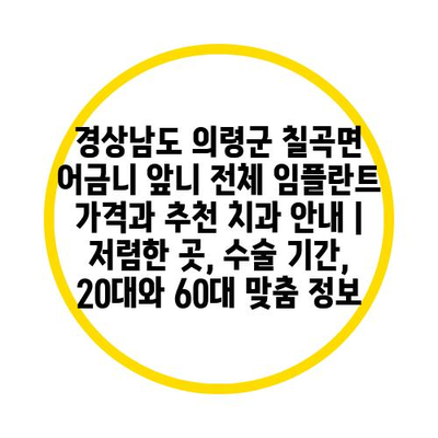 경상남도 의령군 칠곡면에서 임플란트를 고려하는 분들을 위해 전체 임플란트 가격에 대한 내용을 제공하고자 합니다. 임플란트 시술은 나이와 개인의 구강 상태에 따라 다르게 나타날 수 있기 때문에, 20대와 60대의 맞춤 내용을 아우르는 것이 중요합니다.