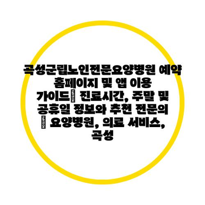 곡성군립노인전문요양병원은 평일 오전 9시부터 오후 5시까지 진료를 진행합니다. 주말과 공휴일은 제한된 시간 동안 진료를 제공하니, 사전 확인이 필요합니다.