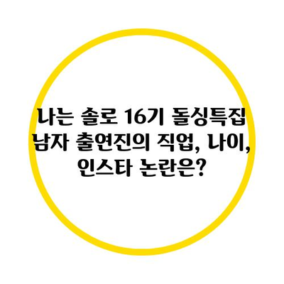 요즘 장안의 화제는 바로 나는 솔로 16기 돌싱특집이다. 특히 남자 출연진들의 직업, 나이, 그리고 인스타그램과 관련된 논란이 많은 관심을 받고 있다. 이번 포스트에서는 각 남자 출연자들에 대해 자세히 알아보도록 하겠다. 이들이 보여주는 다양한 매력과 함께 그들의 개인적인 이야기에 대해 깊이 탐구하겠다.