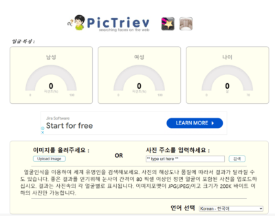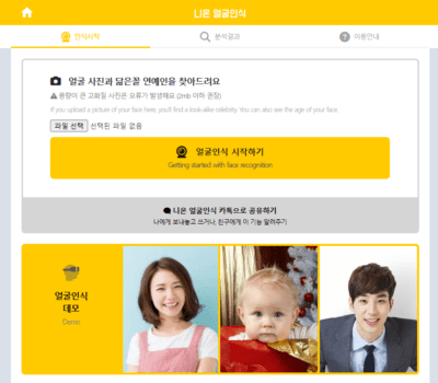 결과는 사진 속의 각 얼굴별로 표시되며, 이미지 포멧이 JPG(JPEG)이고 크기가 200K바이트 이하인 사진만 가능합니다.
