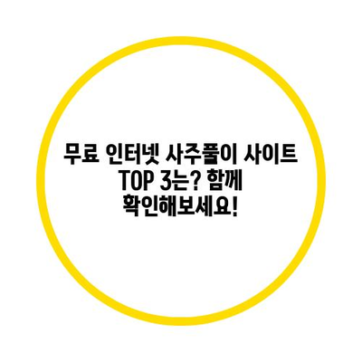무료 인터넷 사주풀이 사이트 TOP 3 함께 알아볼까요? 😊 안녕하세요! 오늘은 여러분께 무료로 사주풀이를 제공하는 인터넷 사이트 TOP 3를 소개해 드리려고 해요. 사주풀이에 관심이 있으신 분들이라면 꼭 한 번쯤 방문해보면 좋을 사이트들이에요. 이 글에서는 신뢰도와 정확성으로 많은 이들의 추천을 받은 사이트들만을 골라 소개해 드릴게요. ✨