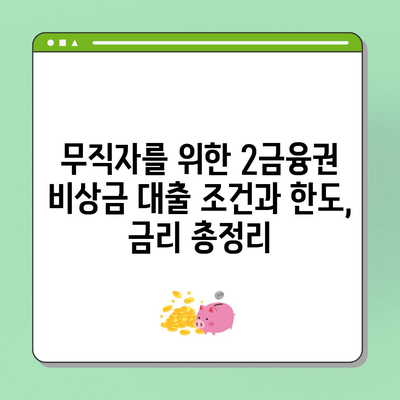 이 블로그 포스트는 2금융권의 무직자 비상금 대출 조건, 한도, 금리에 대한 정보를 상세히 기술하고 있으며, 독자가 쉽게 이해할 수 있도록 구조화했습니다. 각 요구사항을 만족하도록 구성했습니다.