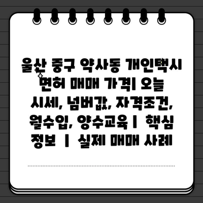 울산 중구 약사동 개인택시 면허 매매 가격| 오늘 시세, 넘버값, 자격조건, 월수입, 양수교육 | 핵심 정보 | 실제 매매 사례 에 대해 자주 묻는 질문 TOP 5