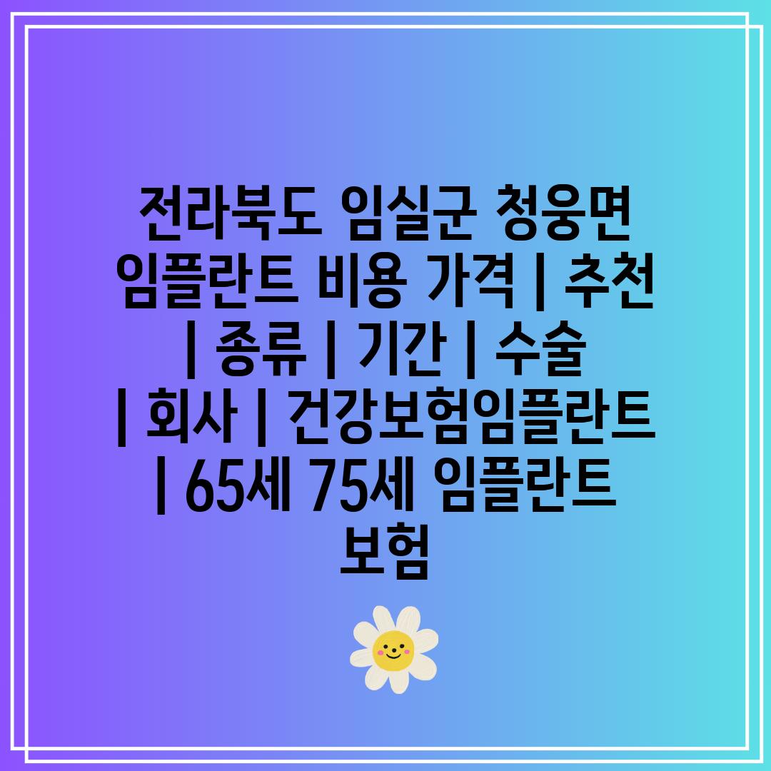 전라북도 임실군 청웅면 임플란트 비용 가격, 추천 병원, 종류, 수술 기간, 회사, 건강보험임플란트, 65세 75세 임플란트 보험에 대해 알려드리겠습니다.