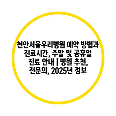 천안서울우리병원 예약 방법과 진료시간, 주말 및 공휴일 진료 공지 | 병원 추천, 전연락, 2025년 정보 에 대해 자주 묻는 질문 TOP 5