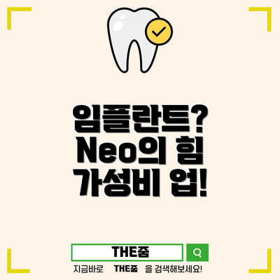치아 임플란트를 고민하고 있다면, Neo 임플란트는 가성비와 품질 면에서 매우 유용한 선택이 될 것입니다. 치아를 잃는 것은 평생의 후회로 이어질 수 있지만, Neo 임플란트를 통해 그 걱정을 덜 수 있습니다.