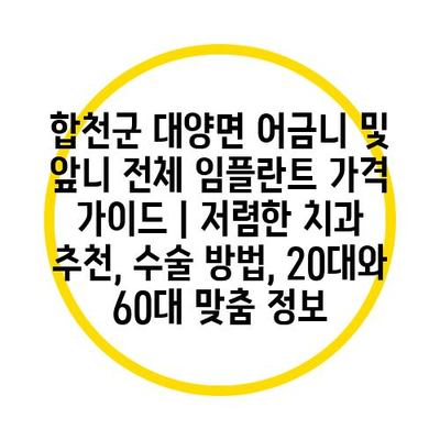 이 표는 각 치아 종류에 따른 평균 비용을 보여주며, 잇몸 건강과 개인의 경제적 여건에 따라 신중하게 선택해야 합니다. 특히 합천군 대양면에서는 지역 내 치과의사들과 충분한 상담 후 결정하는 것이 중요합니다. 이에 따라 개인에게 맞는 최적의 치료법을 찾는 것이 할 수 있습니다.