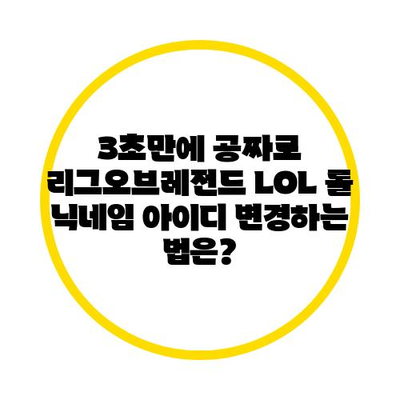 3초만에 공짜로 리그오브레전드 LOL 롤 닉네임 아이디 변경하는 방법에 대해 알려드린 내용을 정리하자면, 로그인 후 상점에서 계정 관리로 이동하여 간단한 단계를 통해 쉽게 변경할 수 있습니다. 변경은 90일마다 가능하므로 전략적으로 다양한 아이디를 사용할 수 있어 친구들과의 게임에서도 즐거운 경험을 만끽할 수 있습니다. 새로운 닉네임을 통해 게임의 재미를 더하고, 자신만의 유니크한 캐릭터를 만들어 보세요!