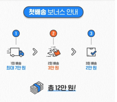 쿠팡 플렉스의 경우 첫배송 보너스라고 해서 3번만 해도 최대 12만원의 프로모션을 받을 수 있습니다. 그리고 친구 추천 프로모션도 있는데, 친구를 초대하면 9만원의 보너스를 추가로 받을 수 있습니다. 참여방법은 다음과 같습니다.